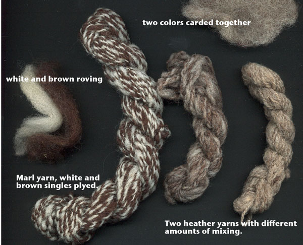 Wool comes in a variety of shades of white, tan, brown, to black that can be spun separately or carded together to get natural heather shades. One of the advantages of using natural wool is that as it requires less treatment than dyed wool, it tends to be stronger and can wear better. The natural lanolin (grease fleece) can be used to lubricate the wool during carding and spinning, especially if the fleece is recently shorn. A final wash sets the twist and removes soil. Often the lanolin is left in.
