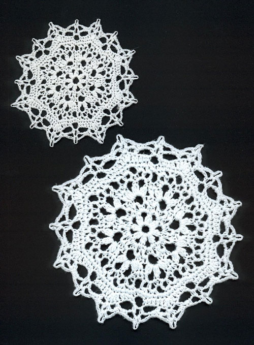 The pattern calls for using bedspread weight cotton thread (size 10) with a size 7 hook. I used Knit-Cro-Sheen with a size 6 hook which made the larger doily. Using a size 10 hook and Clark's Big Ball size 30 white thread resulted in the smaller doily, which is just under 4 inches in diameter when blocked. (24 February 2004) |