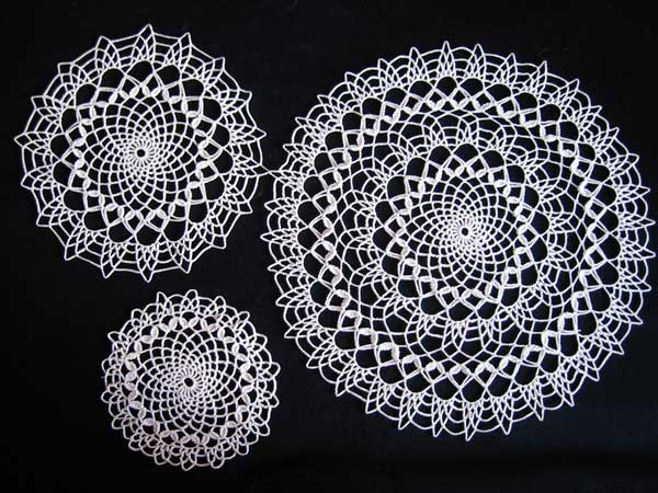 A set of three sizes: glass, bread and butter plate, and place sizes. I worked on the place doily from August 5 through September 13, 2004. It was 12.5 inches across when blocked.