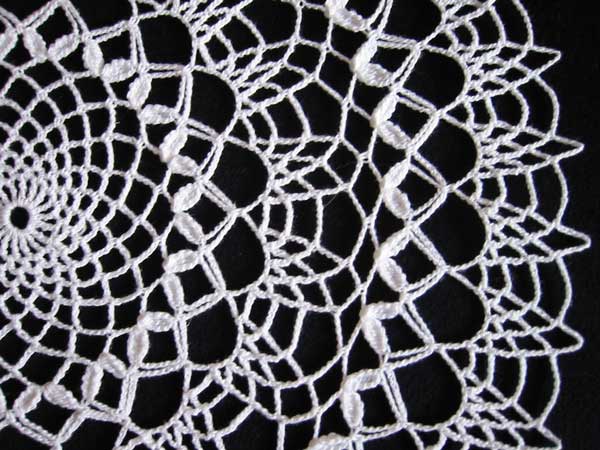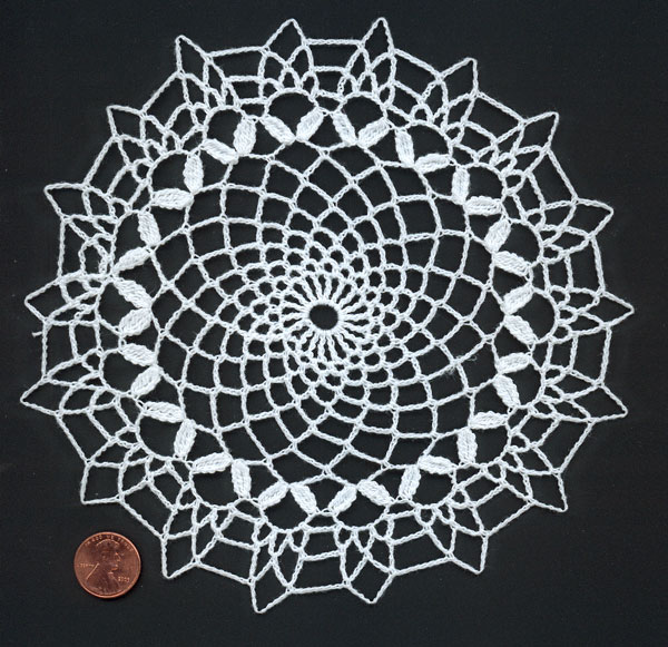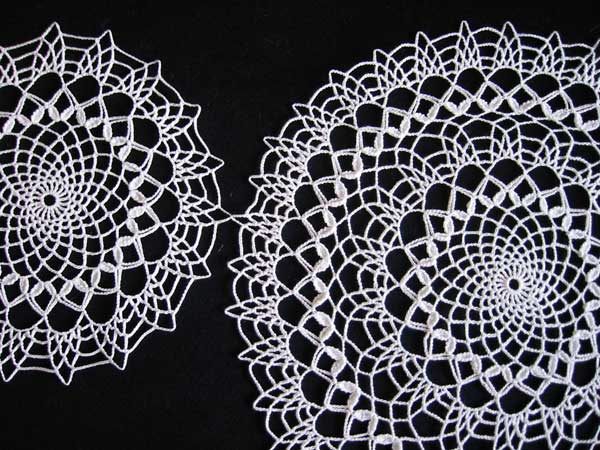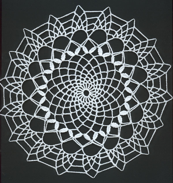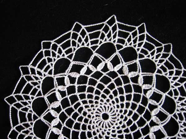 It starts like the glass doily, but at the petal row, a longer chain is used. Two new rows are then made and the doily is finished with an edging similar to the glass doily.