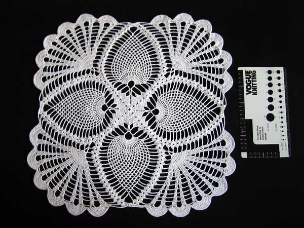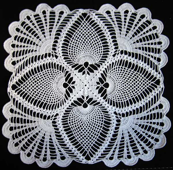 Completed November 14, 2004. My mother liked the pattern, but she wanted a smaller doily. I used a No. 10 Boye steel hook with Size 30 thread, am pleased with the results. I finished a doily using this pattern on January 9, 2004 using Size 10 Southmaid white thread and a No. 6 Boye steel hook. This made a doily that was 18 inches on a side and took just a bit over one ball of thread. This was the first pineapple doily I ever made. This is a striking pattern. I think I like it better in the finer thread though. |