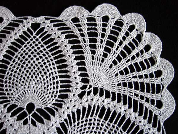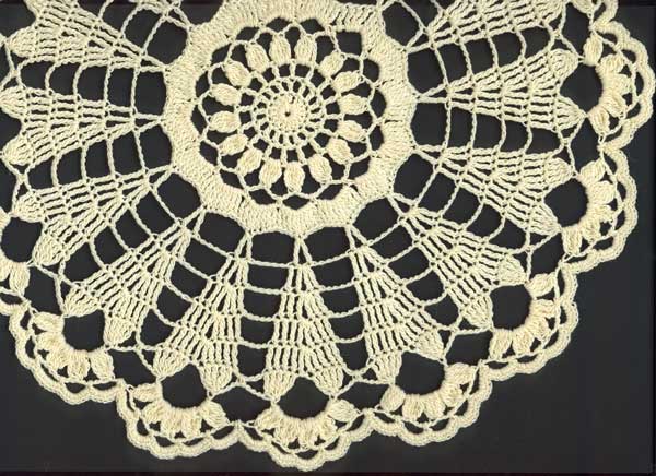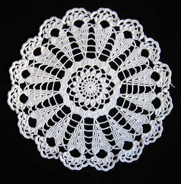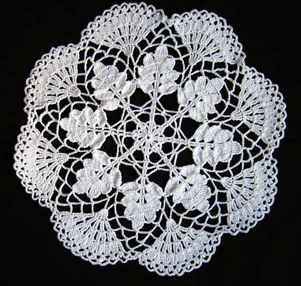 I made several doilies following this pattern. For the one pictured to the left, I used a No. 8 Boye steel hook and completed it in December 2003. I tried the pattern then made several 13 inch doilies in cream Giant thread using a No. 6 in Fall 2003. The scallops on the edge rumple slightly, but it blocks well. It is a nice size for a place setting for a dinner plate or soup bowl. |