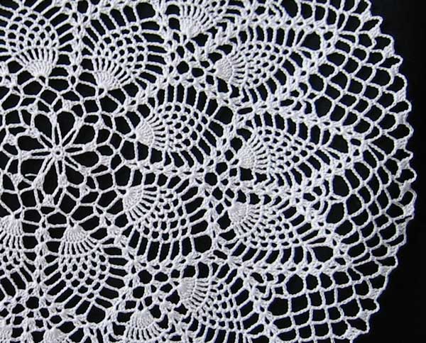This pattern includes two different versions. I began work on the smaller doily on November 21 2004 after finishing the pineapple doily above. I finished it on May 7, 2005 after setting it aside several times. It was 14 inches across (24 rounds) when blocked. The design is similar to the Ripe Wheat doily. There appears to be something missing or misleading in the directions for round 21. I discovered I had made a serious mistake in round 13 when on round 23, so raveled it back. I thought I had caught all them, but discovered one wheat ear had only 3 instead of 4 double treble pairs while I was blocking it. |