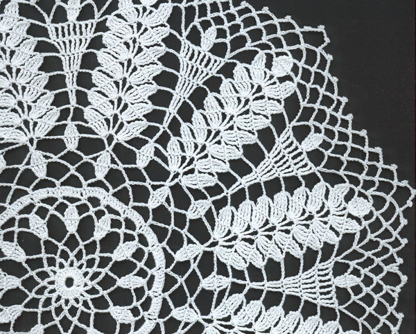 Completed November 21 2004. This doily, attached to one of the balls of thread, and the No. 7 hook was in the bag with the thread and the book. It had been completed up to round 15. I started working on it and was able to complete it through round 29 before the thread ran low. It looked good without the ruffle and I was reluctant to join on another ball. When I washed it and blocked it lightly (no pins) it was 15 inches across. It looks quite lacy because of the use of a relatively large hook in the finer thread. |