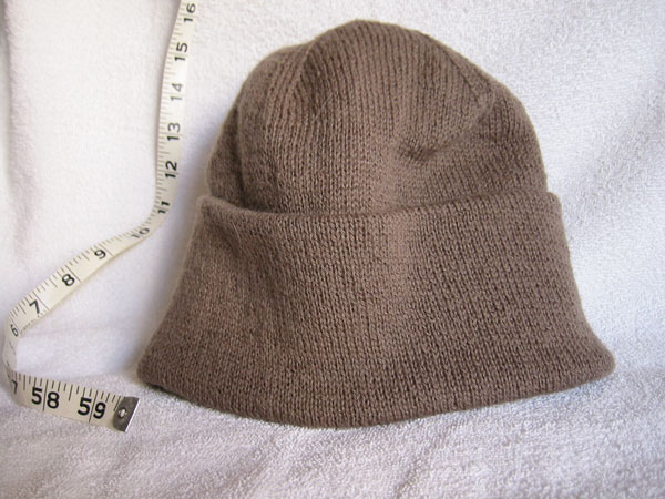 I knit this hat in fine cone yarn that I used to make two pair of socks on size 1 needles. I used size 3 needles with 156 stitches around. Construction is much the same as for the gray hat. It is rather plain, but feels lighter and warmer on than the Lamb's Pride hats in heavier yarn. It weighs less than 3 ounces.