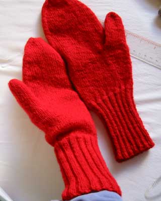 Since completing the socks blog, I have made a brown hat and a couple pair of socks in neutrals. I met someone at the June 2004 Milwaukee Knitters Meetup who wants to learn how to make mittens. So here goes! I am working in bright red for a change of pace.